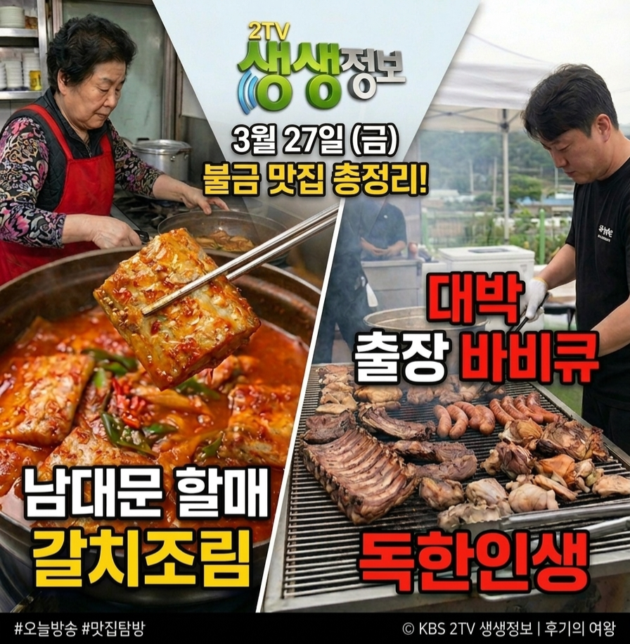 오늘 방송된 생생정보에서는 정겨운 손맛이 깃든 남대문시장의 노포 갈치조림부터, 시련을 딛고 일어선 인간 승리의 맛 안성 출장 바비큐까지 알찬 맛집 정보가 소개되었습니다.